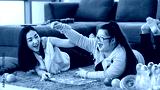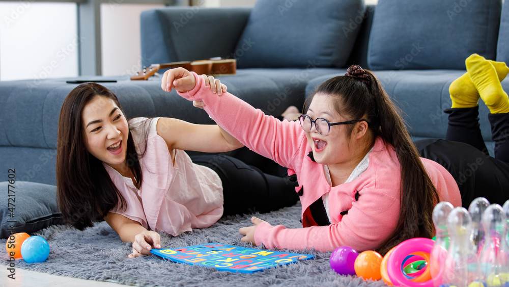 Asian young happy mother laying down on carpet floor near a girl with down syndrome daughter wearing glasses playing smiling laughing and using alphabets puzzle toy teaching together