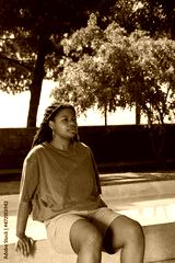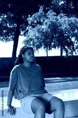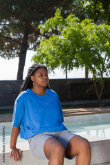 Concentrated African-American woman resting after training. Chubby woman in T-shirt with pierced nose sitting on bench. Sport, body positive concept
