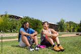 Smiling plus size women resting after training. Chubby women of different nationalities in sport clothes drinking bottled water, laughing, sitting on grass. Sport, body positive concept