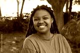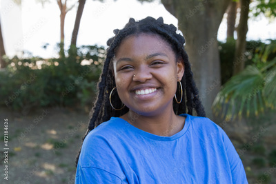 Portrait of joyful African-American woman at park. Chubby woman in T-shirt with pierced nose smiling brightly at camera. Sport, body positive concept