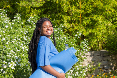 Portrait of cheerful African-American woman doing sports. Chubby woman in T-shirt with pierced nose holding yoga mat. Sport, body positive concept