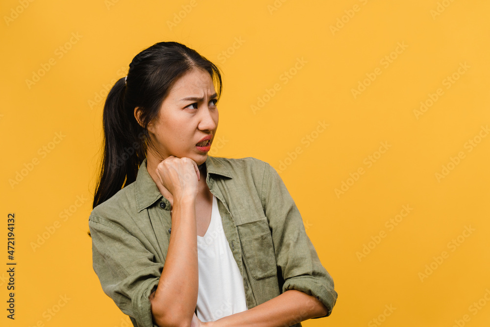 Portrait of young Asia lady with negative expression, excited screaming, crying emotional angry in casual clothing isolated on yellow background with blank copy space. Facial expression concept.