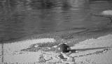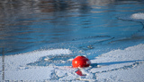 Bright red buoy floating alone in middle of ice and snow in the Baltic Sea in Helsinki, Finland just before complete freeze over of the sea on an extremely cold January afternoon on January 15, 2021.
