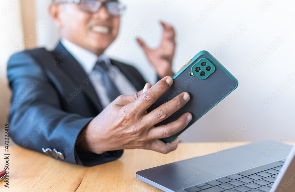Business man disappointed looking on smartphone and laptop with work on workplace