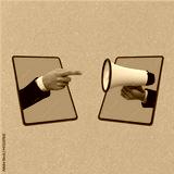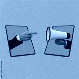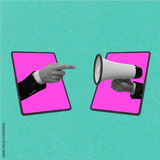 Contemporary art collage of hands sticking out tablet screen with megaphone isolated over mint background