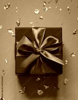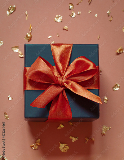 Christmas holiday concept greeting card with a gift box on the beige background. Top view.