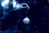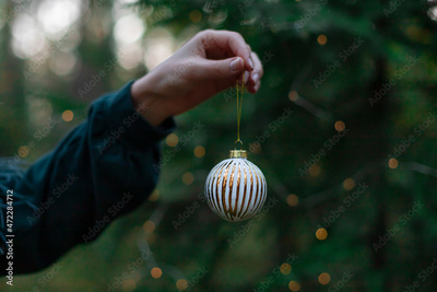 Christmas tree decoration ball in women's hand in forest. Winter holidays celebration concept greeting card