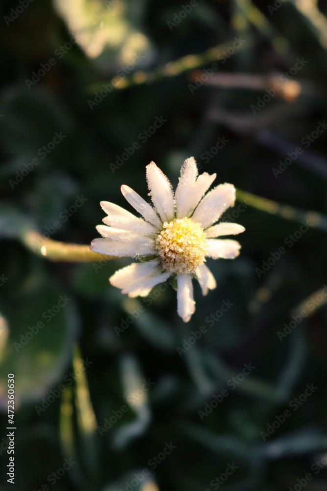 Close-up of frost on yellow and white Common daisy flower. Bellis perennis plant in winter