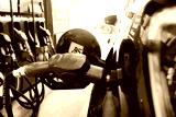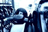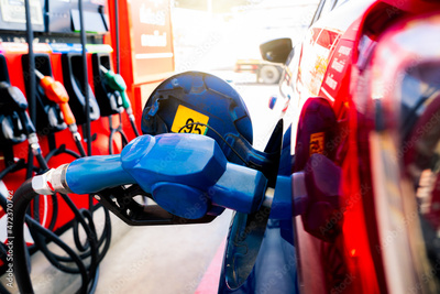 Car fueling at gas station. Refuel fill up with petrol gasoline. Petrol pump filling fuel nozzle in fuel tank of car at gas station. Petrol industry and service. Petrol price and oil crisis concept.