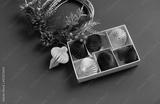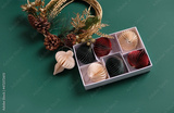 christmas paper toys and festive wreath on green background. Modern christmas decoration, Scandinavian minimal style. New Year and Christmas holiday. festive winter season concept.