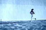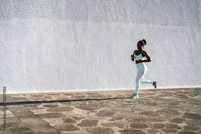 Fit african woman running outdoor in the city during sunset time - Focus on face
