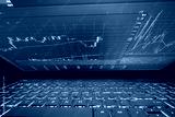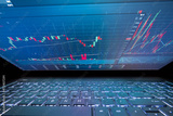 Laptop screen with stock market charts. Technical analysis and fundamental indicators of stock quotes in the trading terminal. Japanese candlesticks and company tickers.