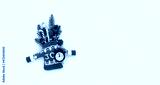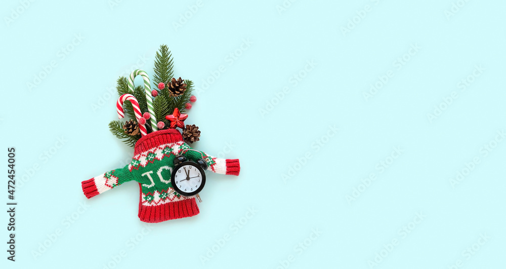Christmas sweater with alarm clock, decor and candy canes on blue background. christmas and new year Holidays. symbol of festive winter season. banner. flat lay. copy space