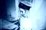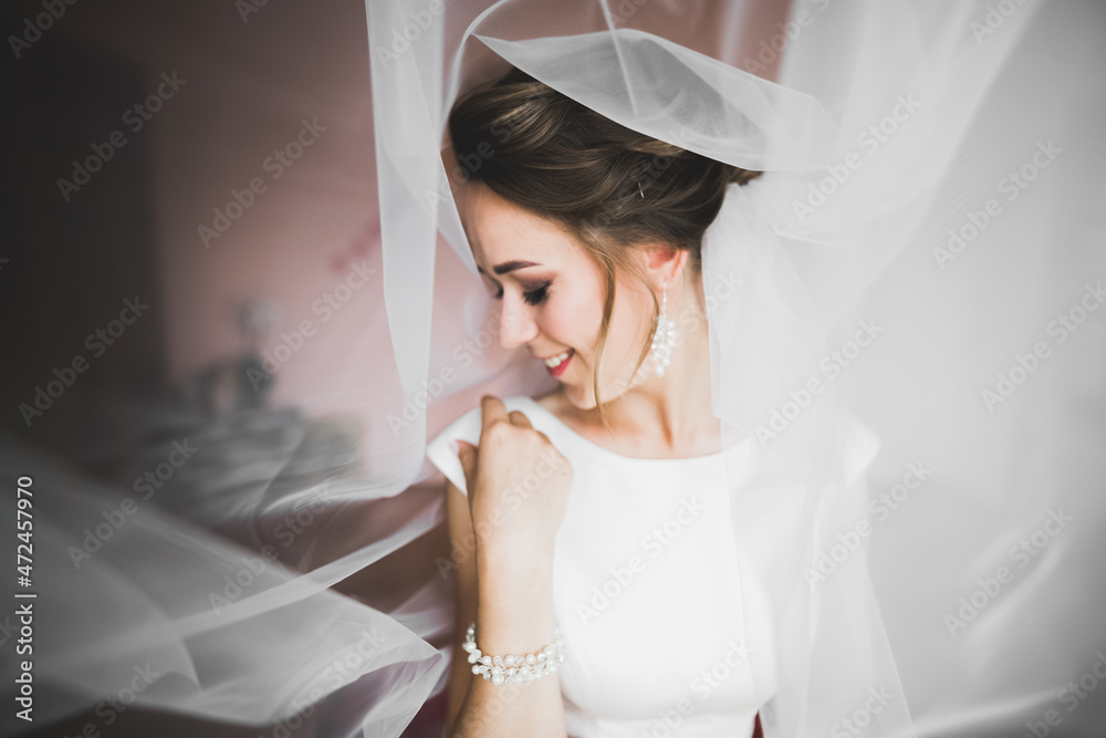 Portrait of beautiful bride with fashion veil at wedding morning