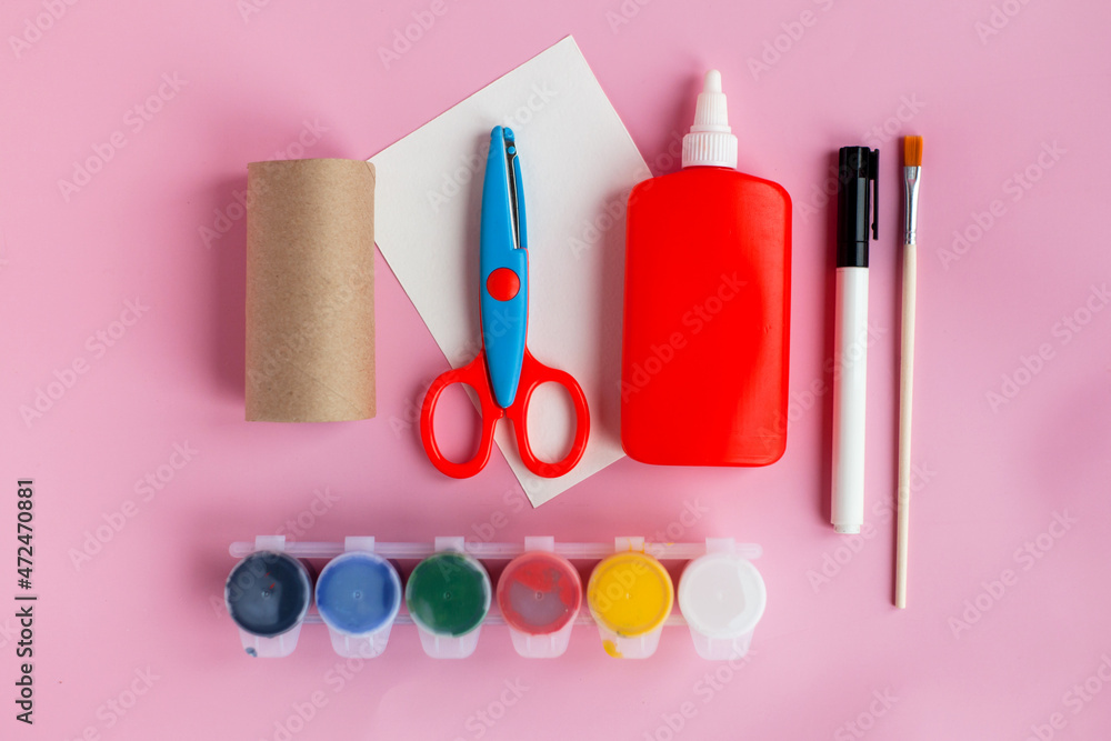 DIY crafts for kids, toilet tube roll, paper, glue, scissors, paint and brush on pink backround. Step by step, New Year, christmas holidays decoration eco-friendly, reuse, recycle handmade concept