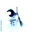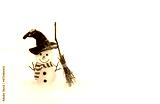 cute snowman toy in witch hat with broomstick on white winter abstract background. New Year and Christmas holiday. festive winter season concept. copy space
