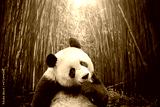 Hungry giant panda bear eating bamboo in forest