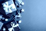 Elegant Christmas card mockup. Flat lay Christmas gifts, fir branches, decorations on blue table. Top view.