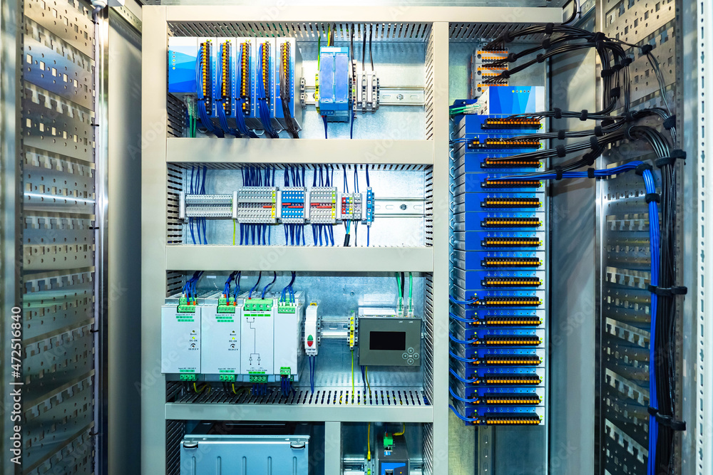 Voltage distributor with circuit breakers. Electrical background. Switchboard with many switches and cables. Internet switchboard. Low-voltage cabinet. Uninterrupted power. Electrical power.