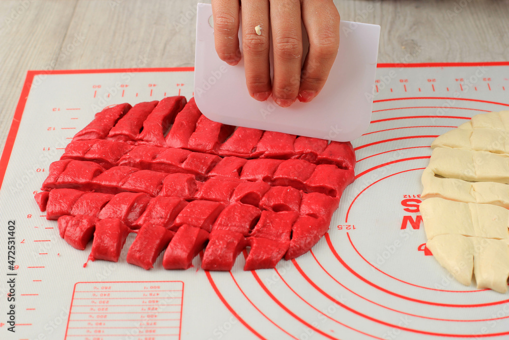 Divided Red Raw Bread Dough Using Plastic Scrapper, Baking Process Step By Step