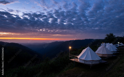 ฺTop beautiful view landscape point from tourist campsite accomodation outdoor with nature of green mountain blue sky background.