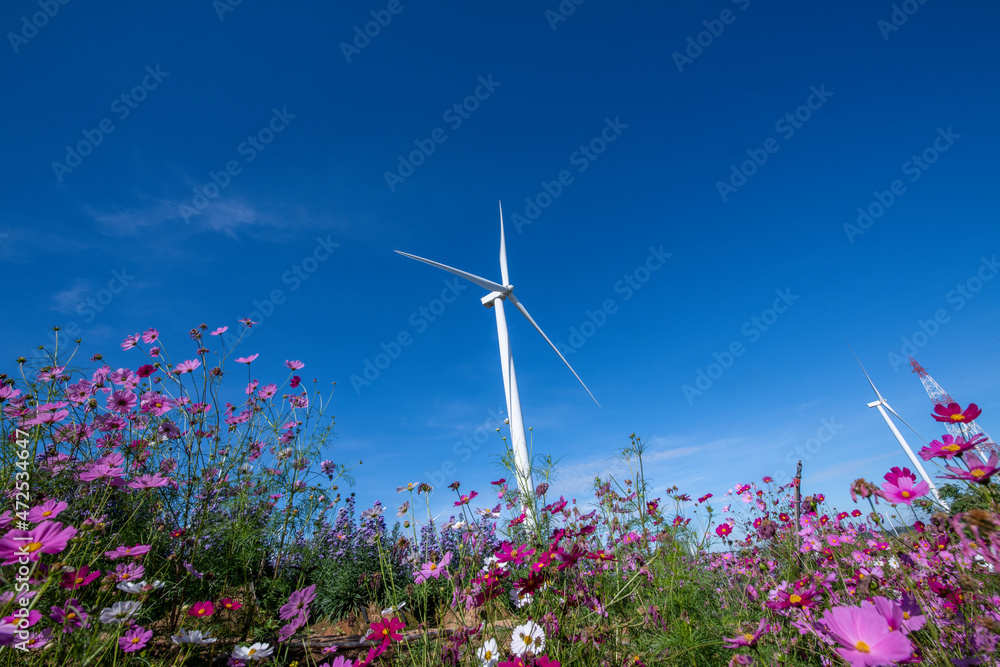 Windmills alternative electric energy power with blooming flower with beautiful blue sky background.