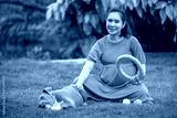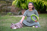 Pregnant woman sitting with dog at home, American bully dog puppy funny and cute, Dog mom happy family