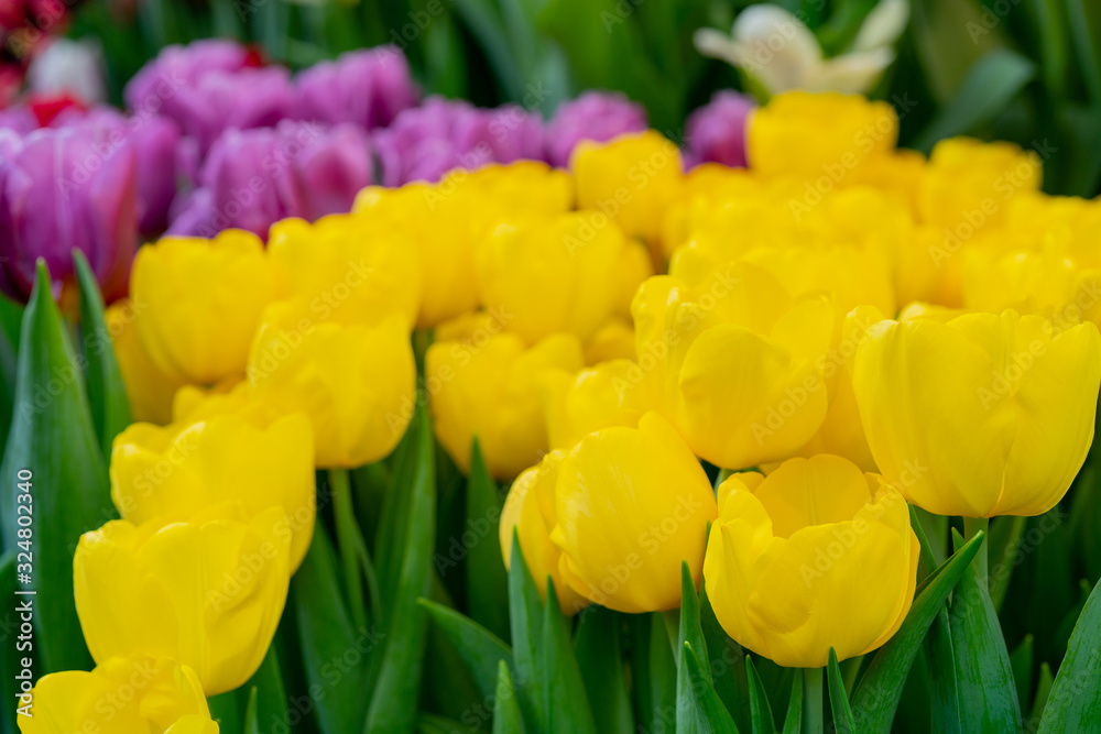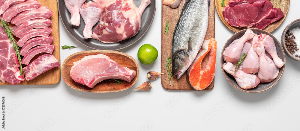 Assortment of raw fresh meat on gray pastel background. Beef, pork, fish, chicken and duck. Top view, flat lay. Wide composition.