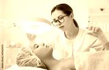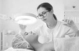 Woman who works as esthetician giving injection or hyaluronic acid filler to client under lamp magnifier. Youthful lady getting face treatment at beauty salon or clinic of aesthetic medicine