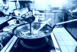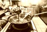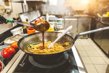 street food. fried noodles in a wok with chicken and shrimp on the wok.