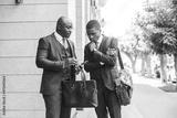 Portrait of two black African American businessman in suits exchanging business cards and contacts outdoors.
