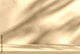 Wooden table mockup on beige stucco background with branch shadows on the wall. Mock up for branding products, presentation and health care.