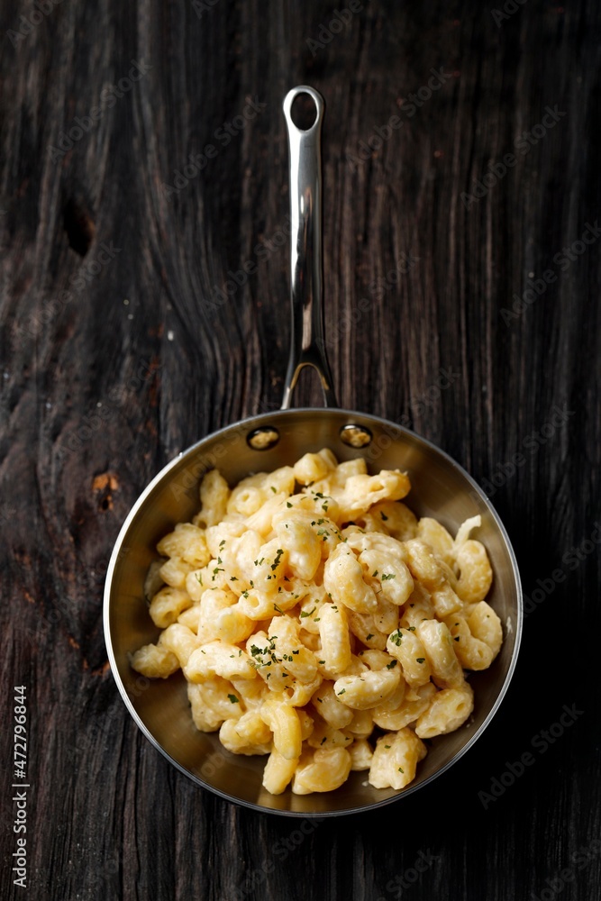 Creamy Macaroni and Cheese on a Skillet Oan with Parmesan and Herbs, Isolated on Wooden Table, Top View