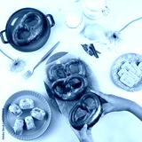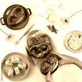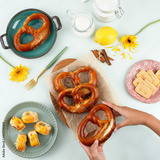Top View Flat Lay Snacking Time with Hand, Pretzel, Biscuit, and Pastry Roll with Melted Cheese . Suitable for Social Media Feeds or Advertisement