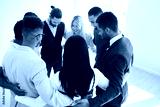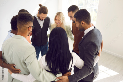 Diverse team of happy business people hugging in office. Group of young multi ethnic mixed race businessmen and businesswomen standing together holding arms around each other. Teamwork, unity concept