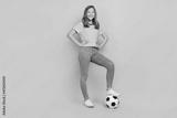 Full body photo of pretty small blond girl play football wear t-shirt jeans footwear isolated on pink background