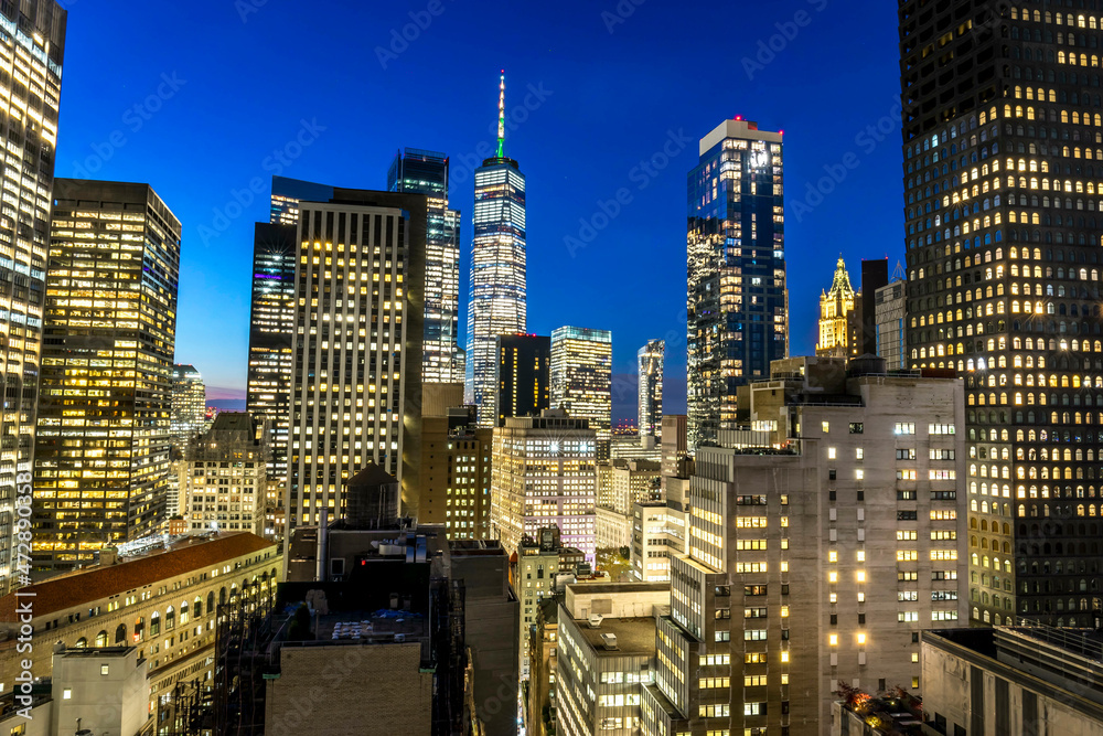 New York City skyline aerial panorama view at night with Lower Manhattan and One World Trade Center
