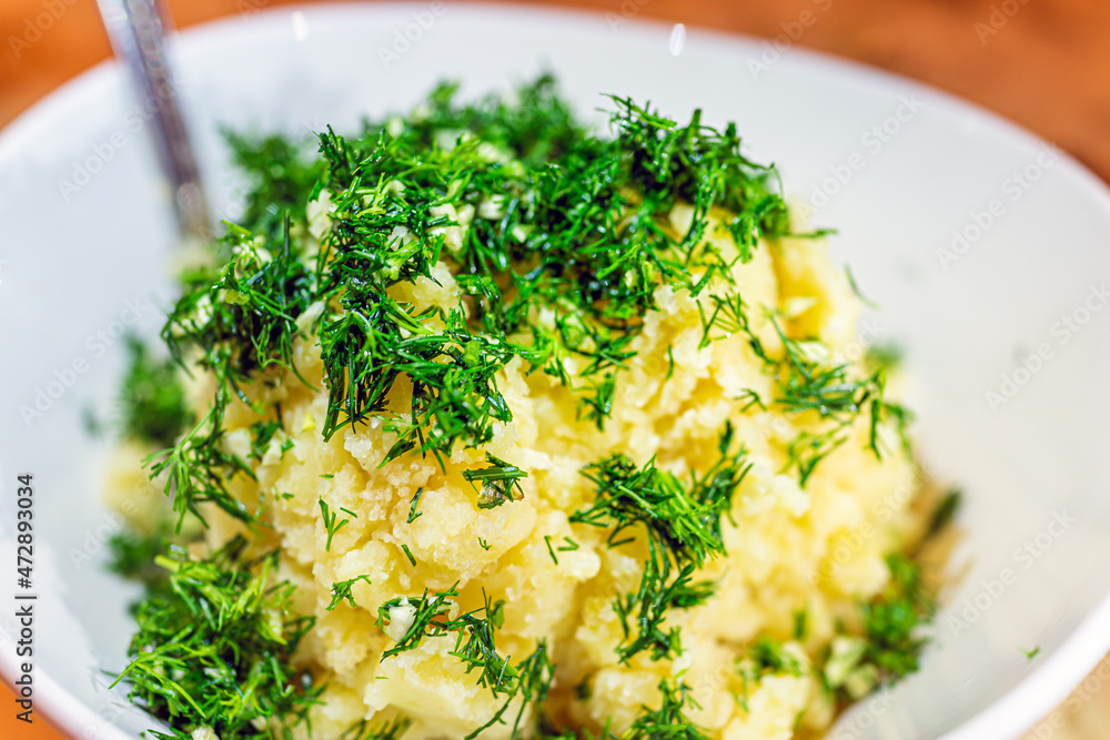 Closeup of dinner meal vegetables of yellow homemade mashed potatoes with garlic and green dill in white bowl macro with texture