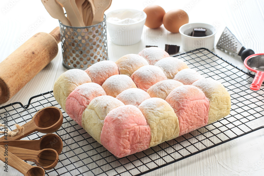 Fresh Baked Japanese Soft and Fluffy Bun Bread, Popular as Hokaido Milk Bread with Pastel Colours