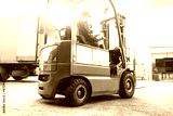 A man on a forklift works in a large warehouse, unloads bags of raw materials