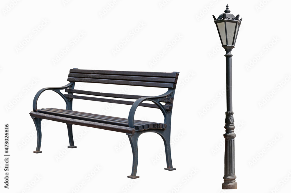 Old wooden street bench in brown tones and vintage street lamp on white isolated background