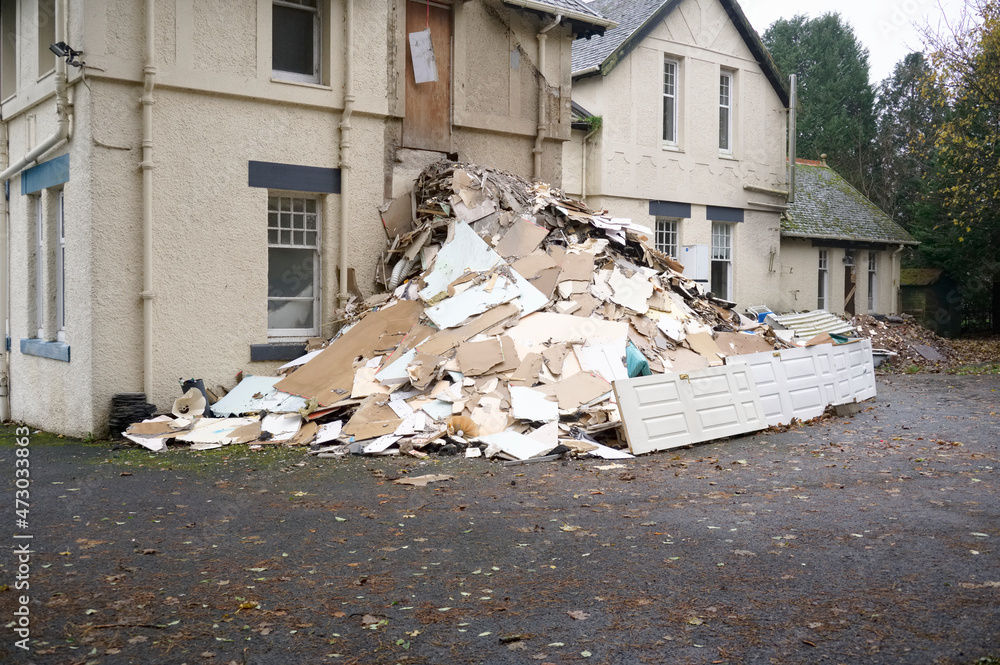 Demolition in progress of derelict house on construction building site