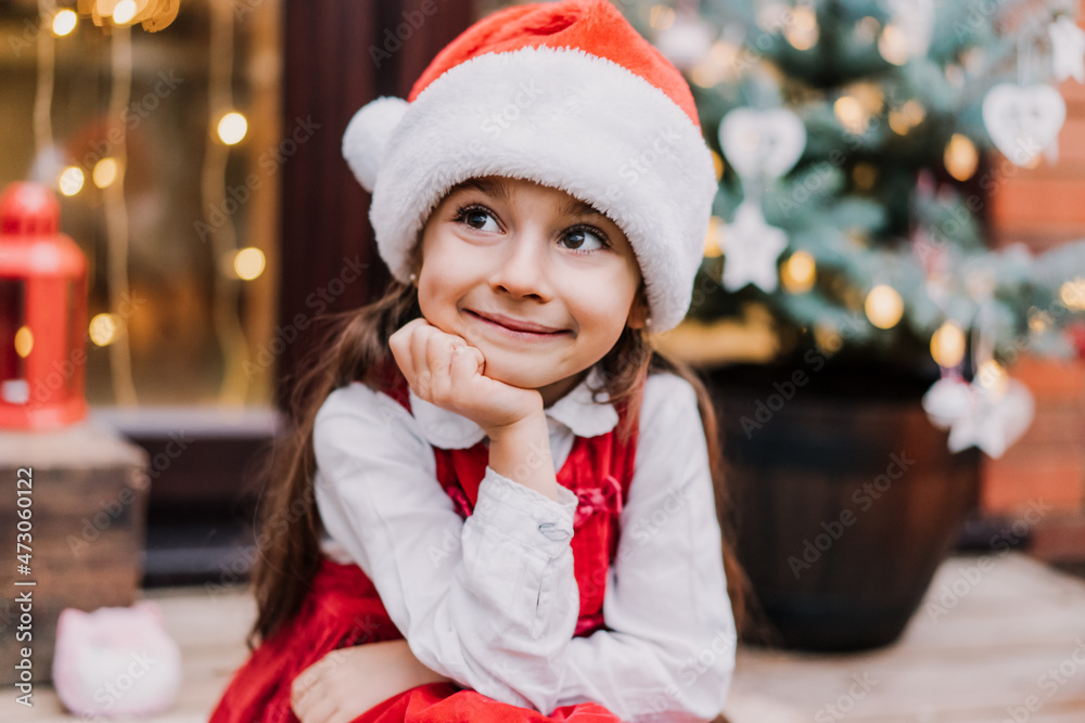 Portrait of emotional smiling cute kid girl in Santa hat and red dress sitting on the porch of a house with decorated Christmas tree. Waiting for Santa and Christmas holidays. Selective focus