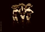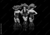 Three beautiful cabaret dancers in red hats isolated on black