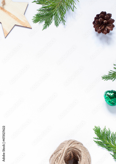 Chritsmas celebration concept frame with festive decoration on the white backdround. Copy space