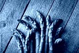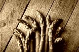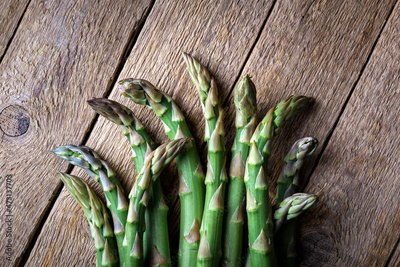 Green asparagus sprouts on wooden board closeup. Top view flat lay. Food photography