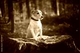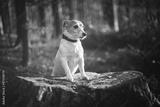 Jack russel terrier dog on pine stem with green moss in autumn forest. Animal and nature photography