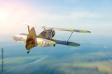 Vintage turboprop plane flying in the sky speed effect, back view.