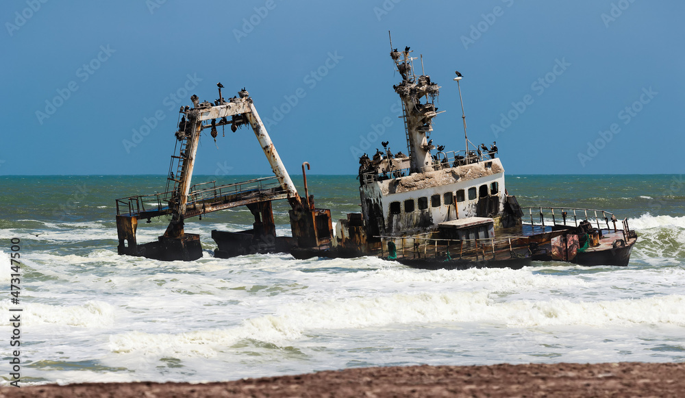 Sunken ship Ziela. Skeleton Coast, Henties Bay, Africa, Namibia.