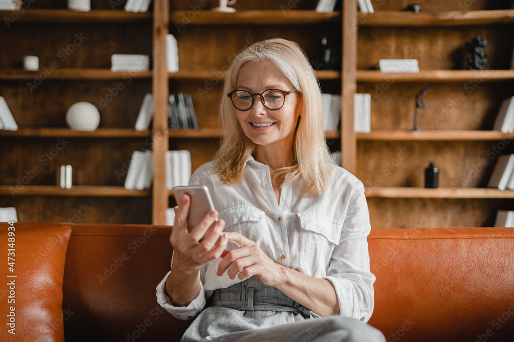 Successful mature middle-aged businesswoman freelancer using smart phone, surfing social media, e-banking, e-commerce concept. Remote work, distance occupation online from home office.